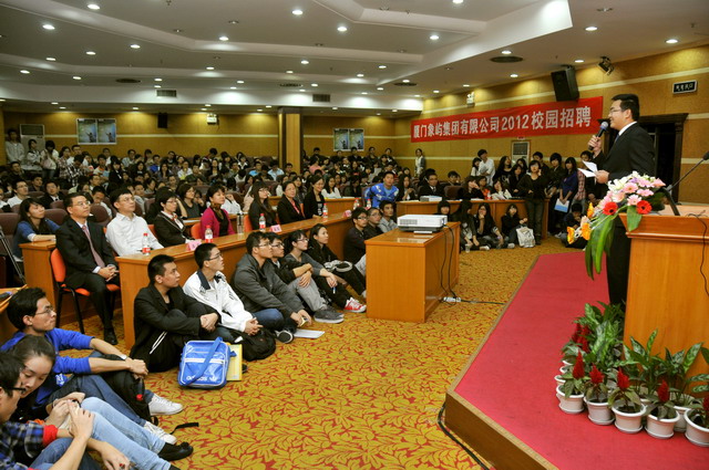 2012年象嶼集團全國校園招聘首場宣講會于1123晚在廈門大學(xué)拉開帷幕。集團人力資源總監(jiān)林志勇、象嶼股份人力資源部經(jīng)理林焱為同學(xué)們進(jìn)行了精彩的宣講并回答了同學(xué)們現(xiàn)場的提問,鼓勵廈大的優(yōu)秀學(xué)子們加入到象嶼的大家庭。據(jù)悉,此次宣講會吸引了近500位應(yīng)屆生參加,場面火爆,提問環(huán)節(jié)積極踴躍,會后現(xiàn)場收到簡歷近500 份。